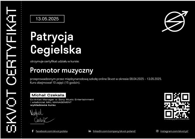 Zrobiłam kurs Promotora Muzycznego i obecnie jestem menadżerką tych zespołów: Madox, Wrong, ANHER oraz Piglets DDeep Forest